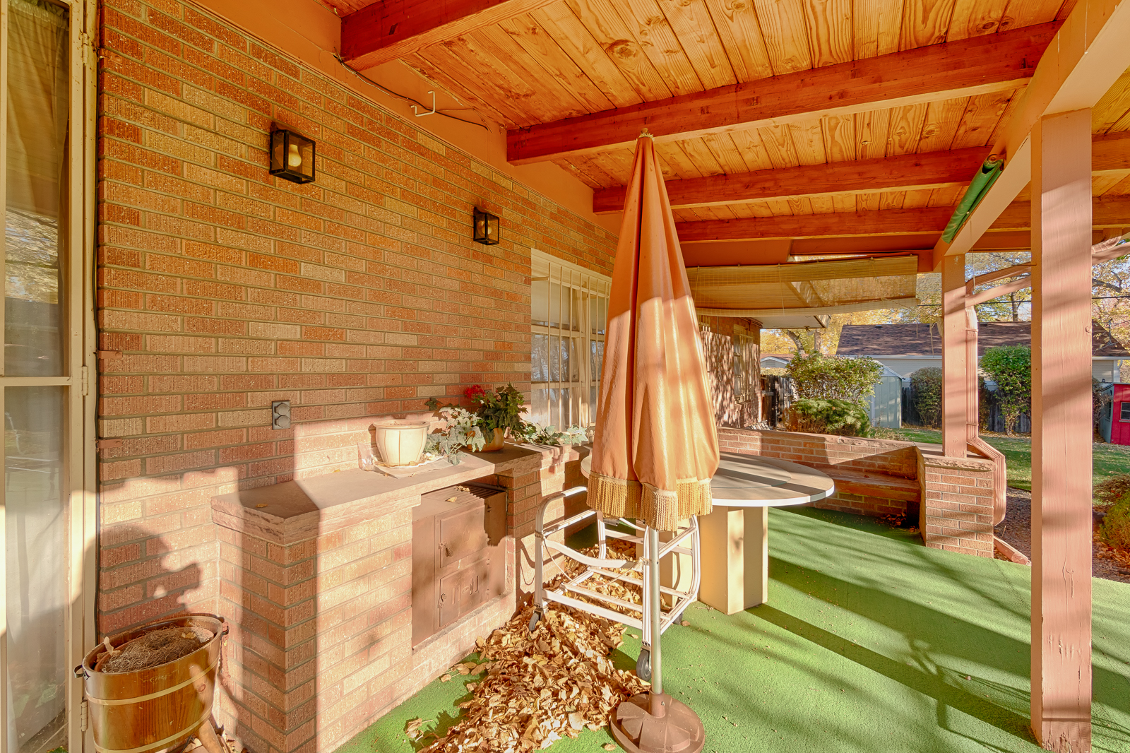 Rear patio with tongue and groove ceiling detail. Post and beam construction mirror the inside family room ceiling for indoor/outdoor continuity.